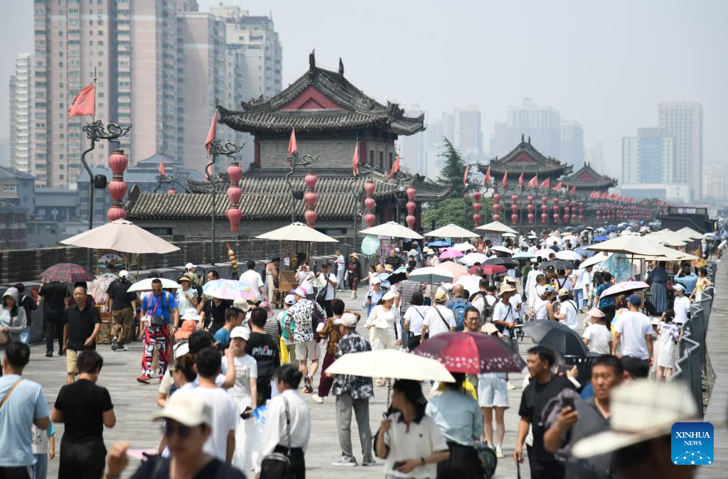 Tourists visit the ancient city wall in Xi'an, northwest China's Shaanxi Province, Aug. 8, 2024.