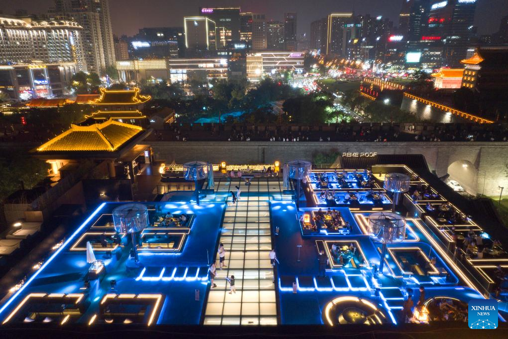 An aerial drone photo taken on Aug. 10, 2023 shows a bar near the south gate of ancient city wall of Xi'an, northwest China's Shaanxi Province.