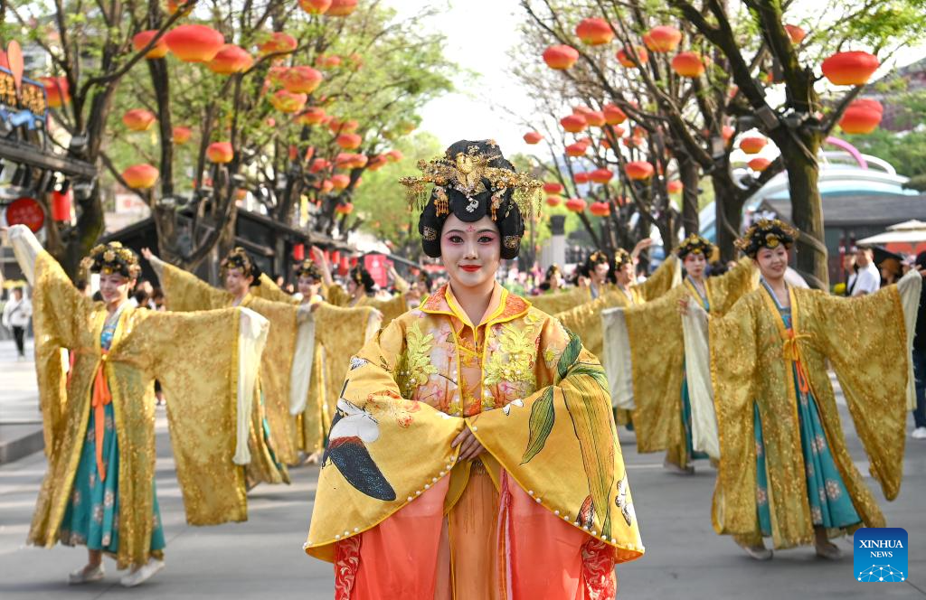 Dancers donning traditional Hanfu attire perform during a parade at the Grand Tang Mall, a Tang Dynasty-themed pedestrian area, in Xi'an, northwest China's Shaanxi Province, April 11, 2024.