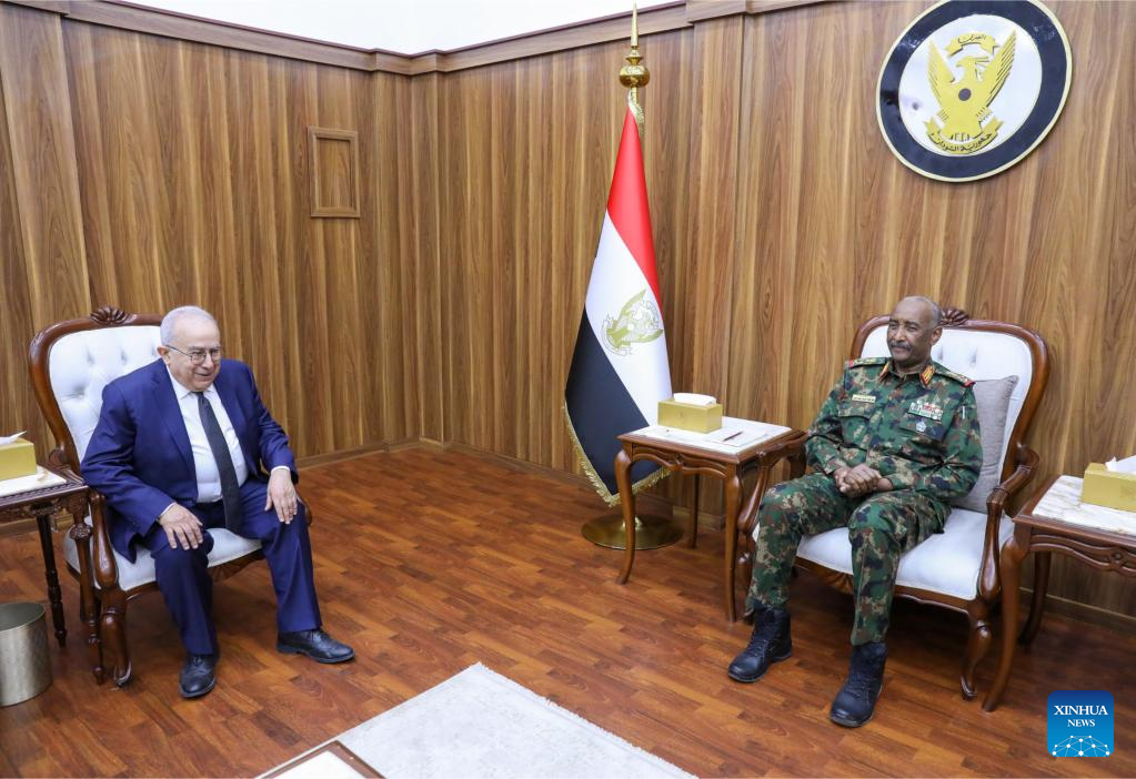 Abdel Fattah Al-Burhan (R), chairman of Sudan's Transitional Sovereign Council and general commander of the Sudanese Armed Forces (SAF), meets with UN Secretary-General's Envoy to Sudan Ramtane Lamamra in Port Sudan, Red Sea State, eastern Sudan, on Dec. 23, 2024. (Sudan's Transitional Sovereign Council/Handout via Xinhua)