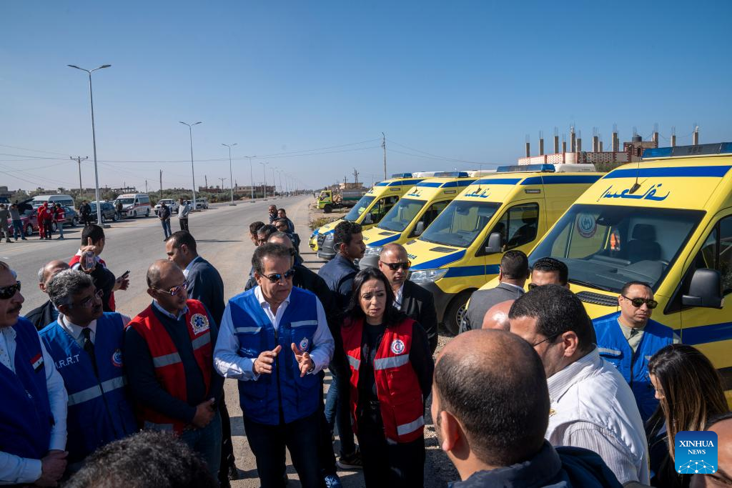 Egyptian Minister of Health and Population Khaled Abdel-Ghaffar (4th L, front row) visits the Egyptian side of the Rafah crossing on Jan. 18, 2025. An Egyptian security source told Xinhua on Saturday that the Rafah crossing, the only channel linking the Gaza Strip with Egypt, will be reopened on Sunday. (Str/Xinhua)
