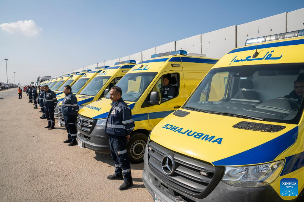 Ambulances wait on the Egyptian side of the Rafah crossing on Jan. 18, 2025. An Egyptian security source told Xinhua on Saturday that the Rafah crossing, the only channel linking the Gaza Strip with Egypt, will be reopened on Sunday. (Str/Xinhua)
