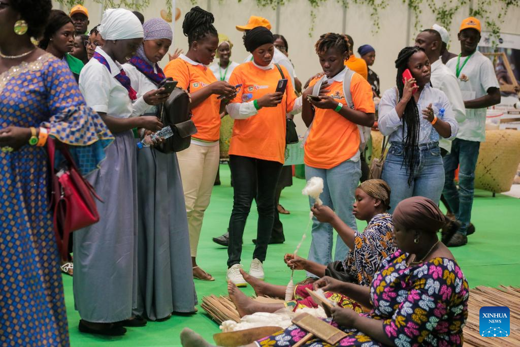 Visitors observe the process of cotton production during the first edition of the National Cotton and Cashew Producers' Day of Cote d'Ivoire, Abidjan, Cote d'Ivoire, Jan. 17, 2025. The event aimed to acknowledge the achievements of national cotton and cashew producers and to enhance the value of these two crucial agricultural sectors for Cote d'Ivoire's economy. (Photo by Laurent Idibouo/Xinhua)