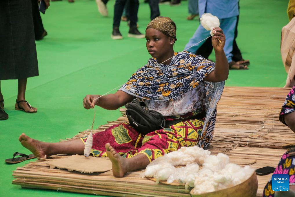 A woman shows the process of cotton production during the first edition of the National Cotton and Cashew Producers' Day of Cote d'Ivoire, Abidjan, Cote d'Ivoire, Jan. 17, 2025. The event aimed to acknowledge the achievements of national cotton and cashew producers and to enhance the value of these two crucial agricultural sectors for Cote d'Ivoire's economy. (Photo by Laurent Idibouo/Xinhua)