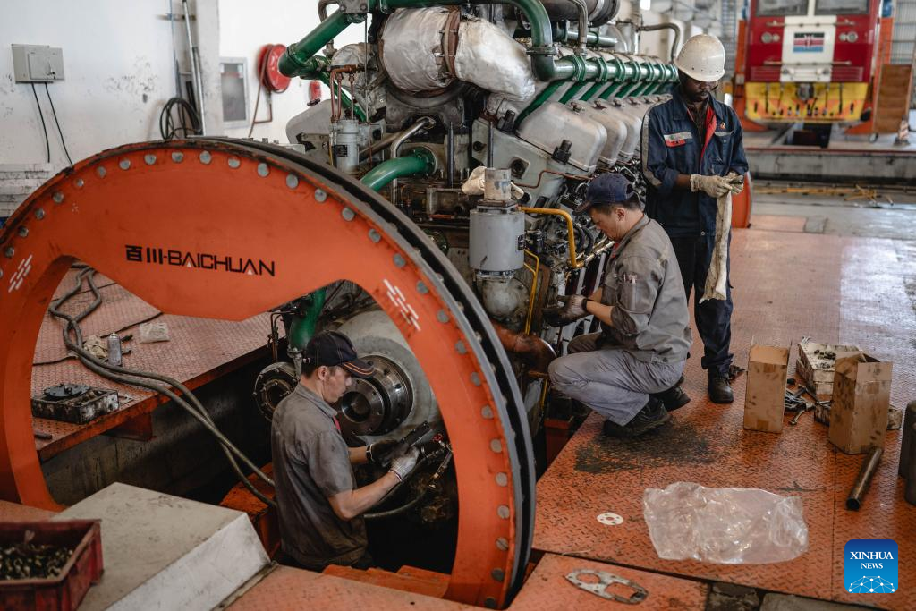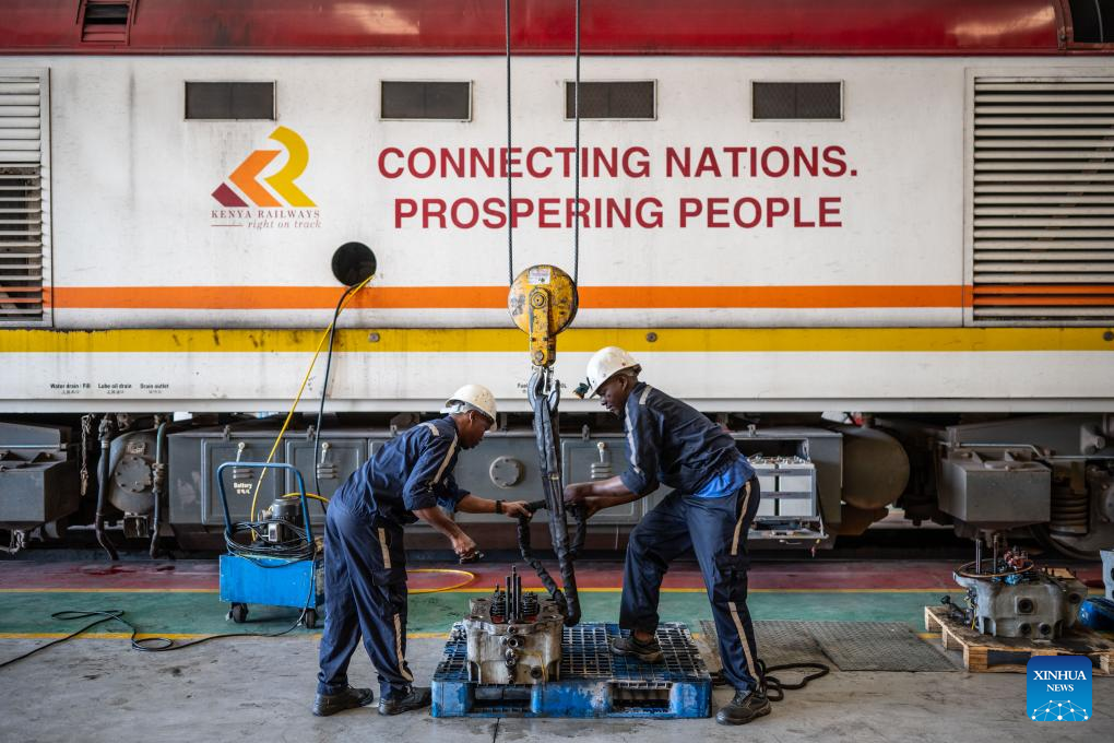 Maintenance workers check locomotive parts in the repair workshop of the Mombasa-Nairobi Railway in Nairobi, Kenya, Jan. 23, 2025. Launched in May 2017, the Mombasa-Nairobi Railway, spanning approximately 480 km, connects the large Indian Ocean city of Mombasa with Nairobi, the country's capital and largest city. It is Kenya's first modern railway since independence and is hailed as a flagship project under the Belt and Road cooperation between China and Kenya.