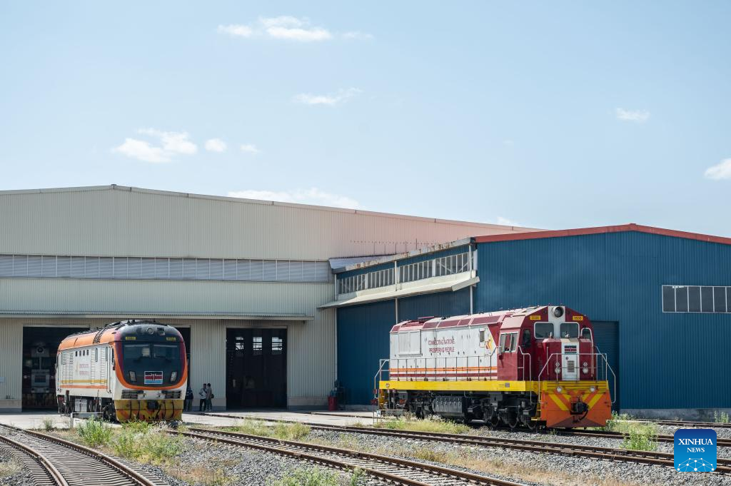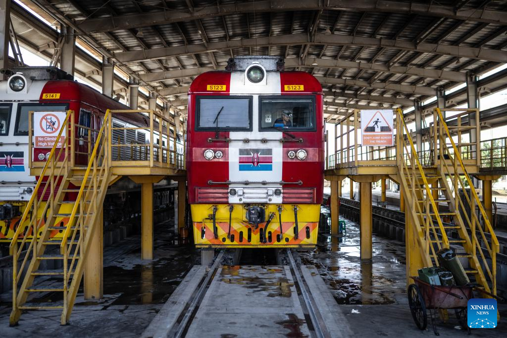 This photo taken on Jan. 23, 2025 shows locomotives waiting for maintenance outside the repair workshop of the Mombasa-Nairobi Railway in Nairobi, Kenya. Launched in May 2017, the Mombasa-Nairobi Railway, spanning approximately 480 km, connects the large Indian Ocean city of Mombasa with Nairobi, the country's capital and largest city. It is Kenya's first modern railway since independence and is hailed as a flagship project under the Belt and Road cooperation between China and Kenya.