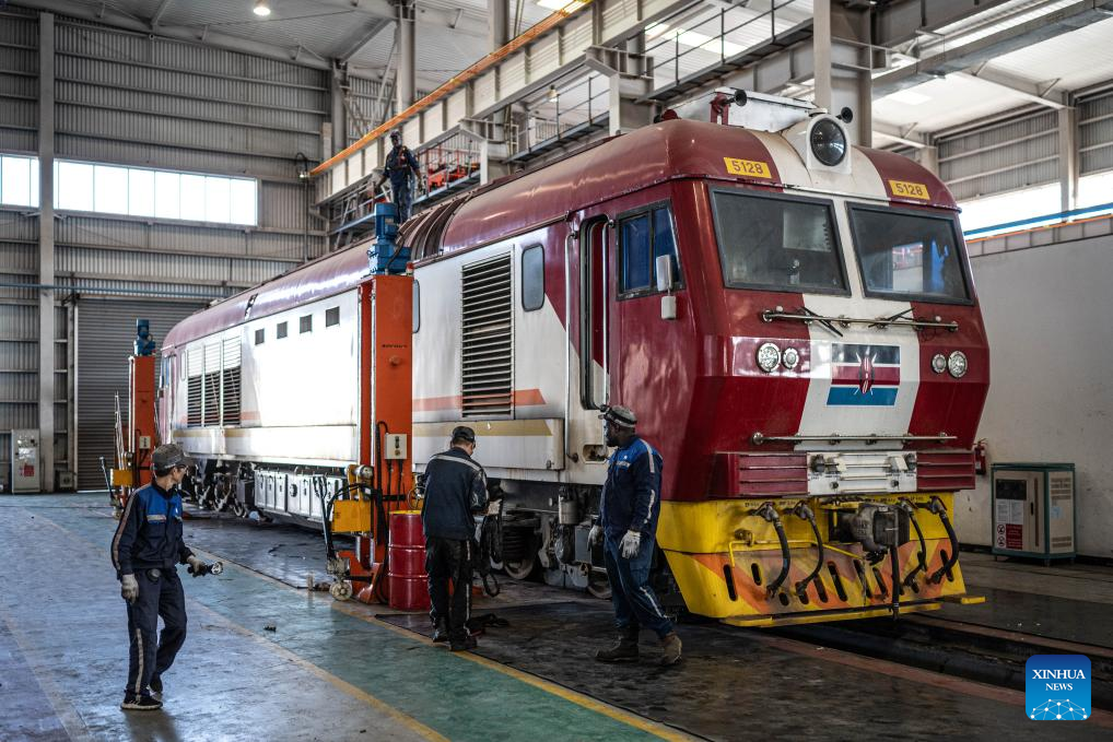 Maintenance workers check the engine of a locomotive in the repair workshop of the Mombasa-Nairobi Railway in Nairobi, Kenya, Jan. 23, 2025. Launched in May 2017, the Mombasa-Nairobi Railway, spanning approximately 480 km, connects the large Indian Ocean city of Mombasa with Nairobi, the country's capital and largest city. It is Kenya's first modern railway since independence and is hailed as a flagship project under the Belt and Road cooperation between China and Kenya.