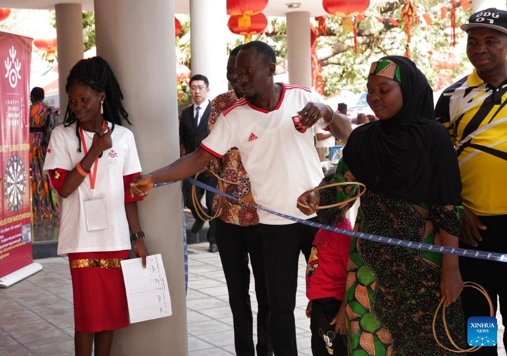 People play a ring toss game at a temple fair in celebration of the upcoming Spring Festival, or the Chinese Lunar New Year, in Abuja, Nigeria, Jan. 25, 2025. (Xinhua/Yang Zhe)