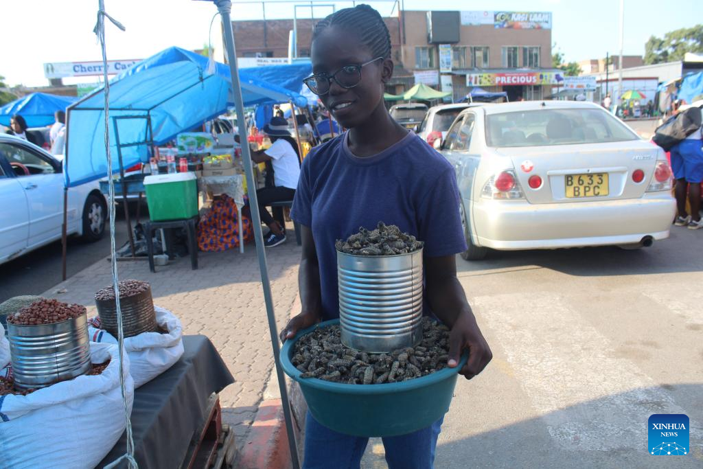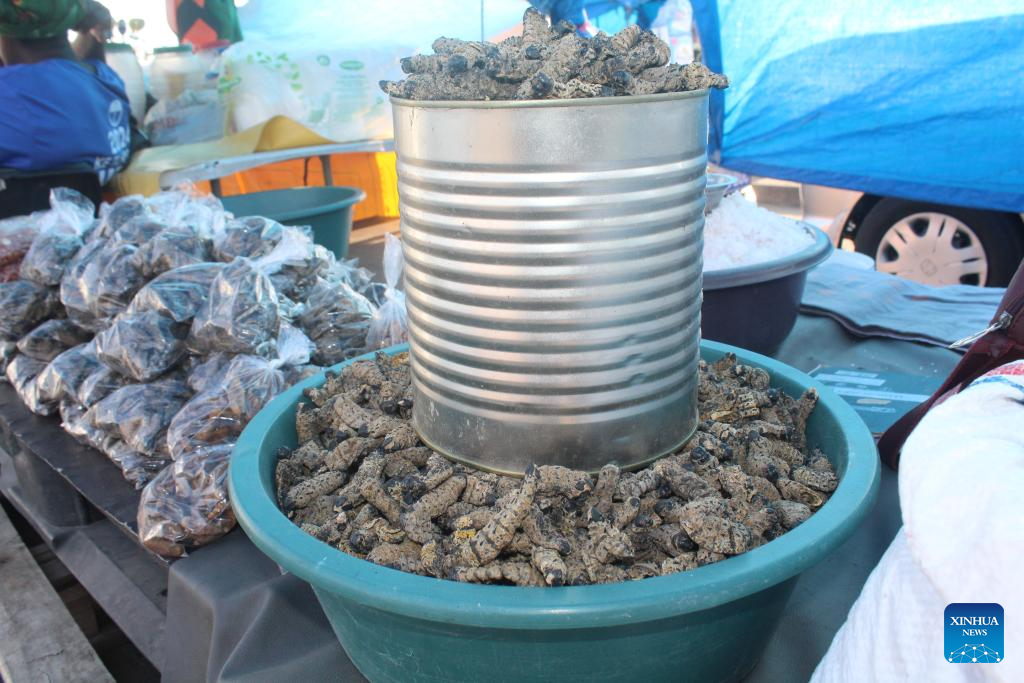 A vendor sells mophane worms at a market in Francistown, Botswana, on Feb. 6, 2025. Botswana's five-pula coin features an engraved image of a mophane worm, a nutritious delicacy popular in southern Africa. But climate change has led to a dramatic decline in mophane worm population, hurting those who rely on harvesting the worms for a living. (Xinhua/Shingirai Madondo)