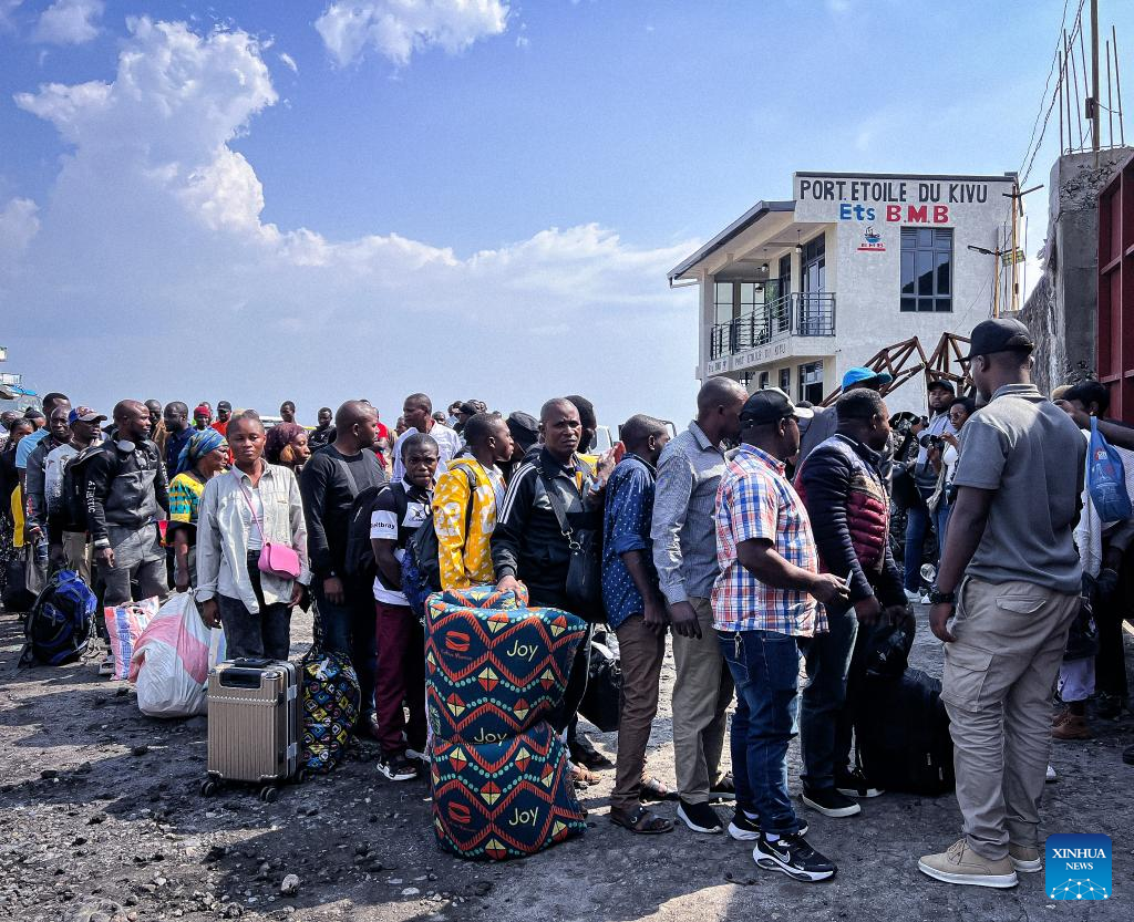 People wait in line to get on board at a dock in Goma, the Democratic Republic of the Congo (DRC), Feb. 18, 2025. (Photo by Zanem Nety Zaidi/Xinhua)
