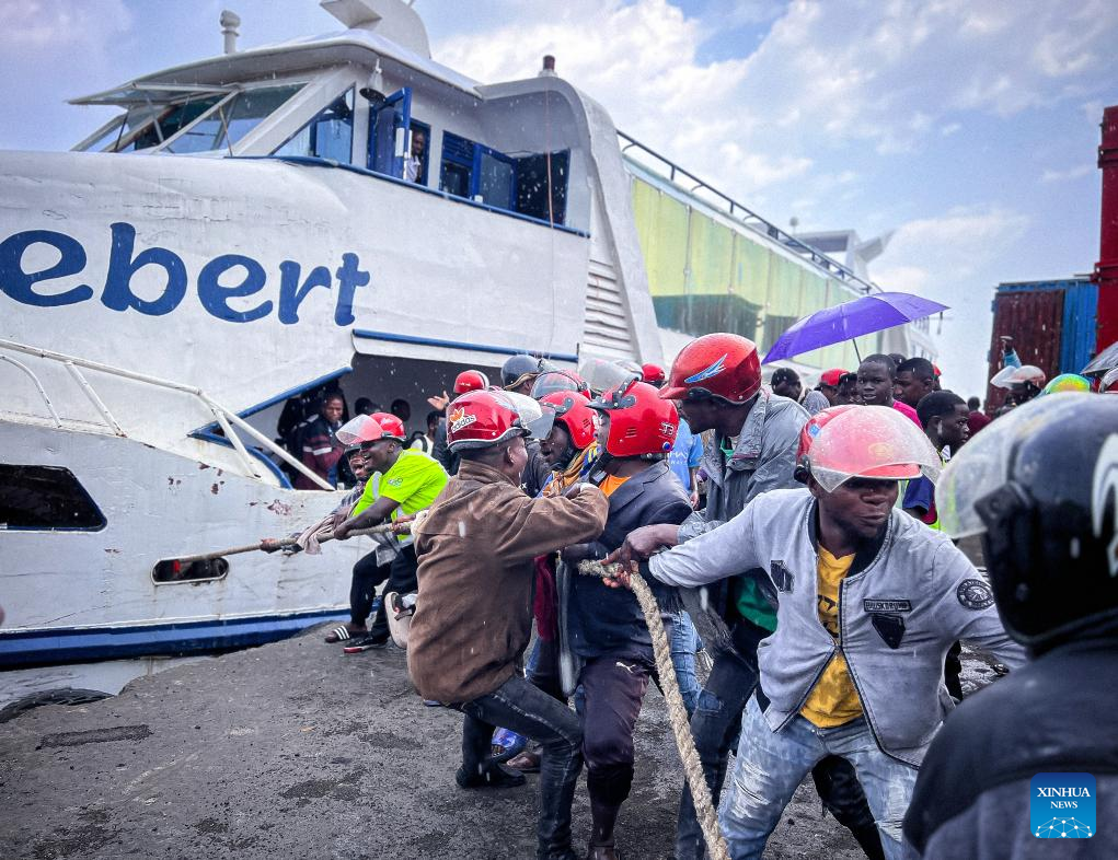 Workers pull a ferry to the wharf at a dock in Goma, the Democratic Republic of the Congo (DRC), Feb. 18, 2025. (Photo by Zanem Nety Zaidi/Xinhua)