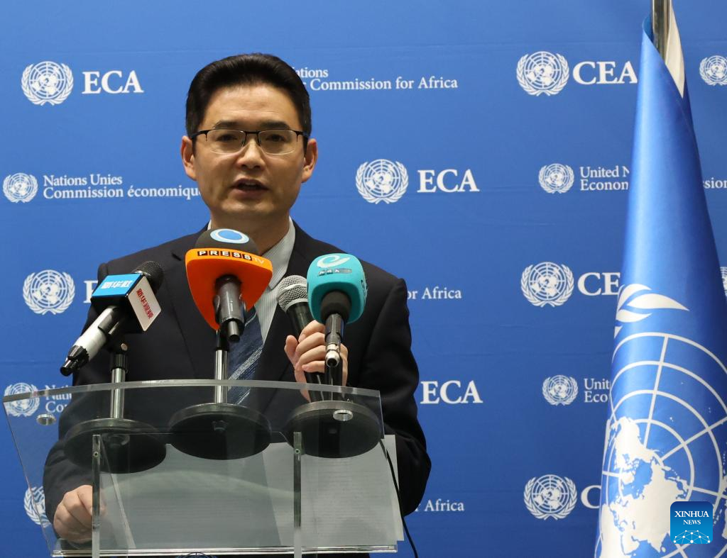 He Youlin, deputy head of the Chinese Mission to the African Union, speaks at a celebration observing International Mother Language Day at the United Nations Conference Center in Addis Ababa, Ethiopia, Feb. 20, 2025. (Xinhua/Habtamu Worku)