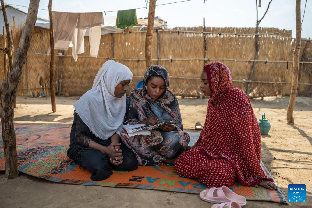 Sudanese refugees read at the Gorom refugee settlement on the outskirts of Juba, South Sudan, Feb. 27, 2025. The Gorom refugee settlement currently hosts approximately 16,000 refugees, primarily from Sudan, with some from Ethiopia and Burundi. The number of Sudanese refugees in Gorom continues to rise. (Xinhua/Wang Guansen)