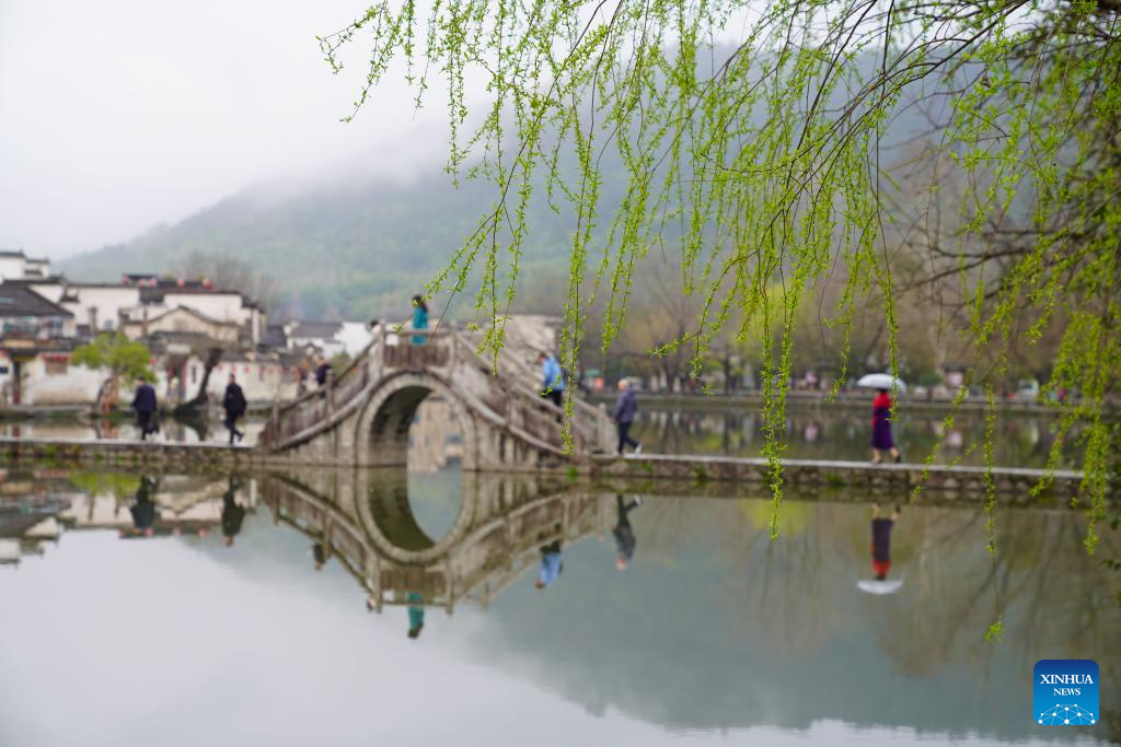 Tourists enjoy themselves at Hongcun Village, Hongcun Township of Yixian County, Huangshan City, east China's Anhui Province, March 14, 2025. (Xinhua/Zhou Mu)