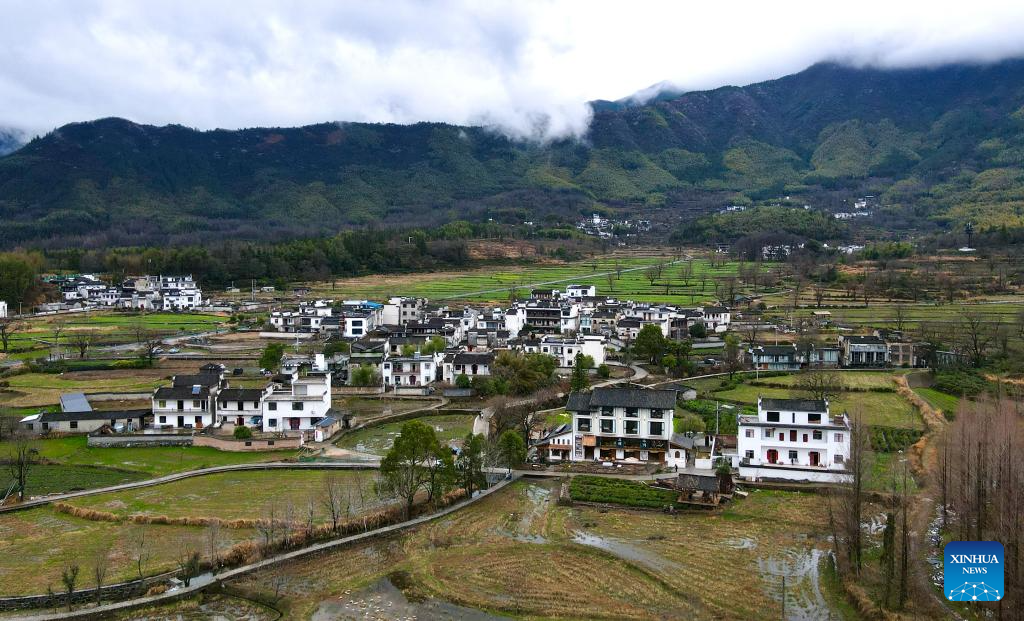 An aerial drone photo taken on March 13, 2025 shows the scenery of Tachuan Village, Hongcun Township of Yixian County, Huangshan City, east China's Anhui Province. (Xinhua/Zhou Mu)