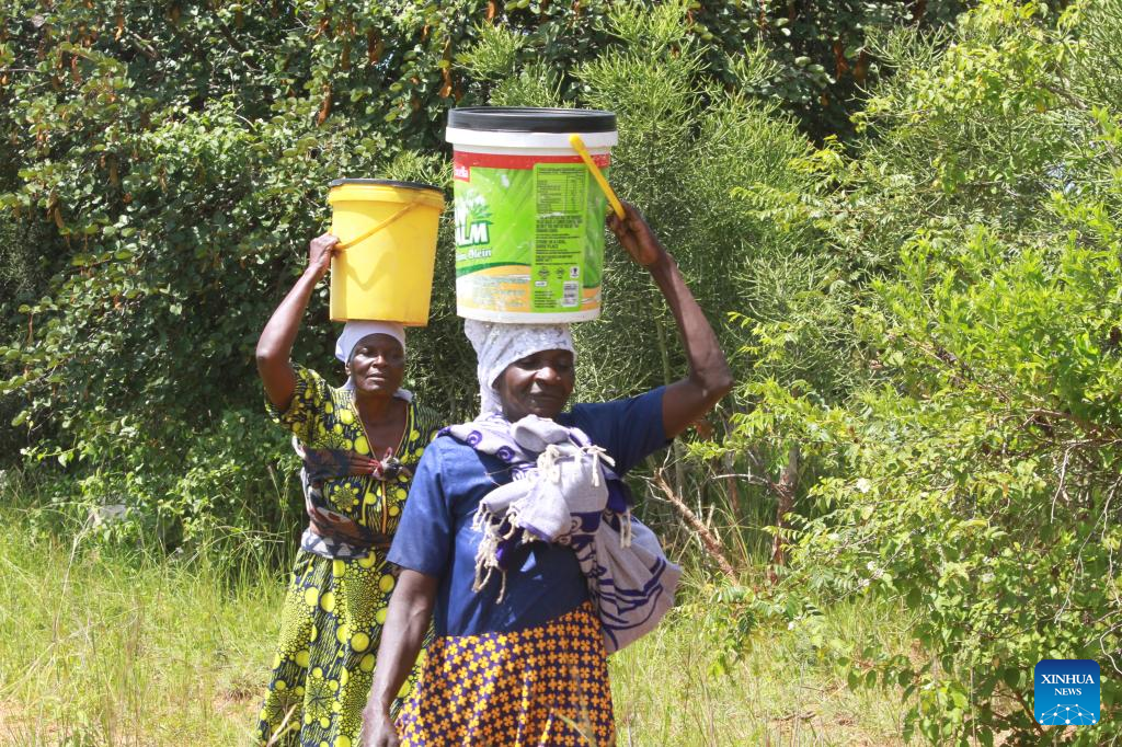 Two women carry buckets of water in Wedza, Mashonaland East Province, Zimbabwe, on March 20, 2025. China on Thursday handed over 66 boreholes to communities in Mashonaland East Province of Zimbabwe, enabling about 16,500 people to access clean water. (Xinhua/Tafara Mugwara)