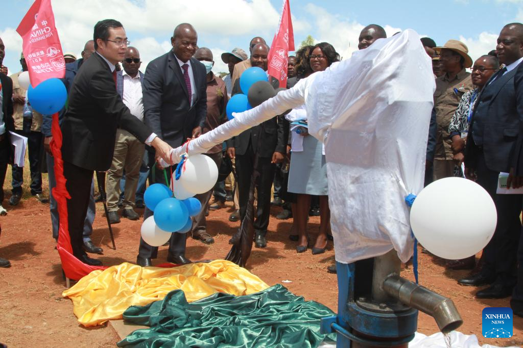 Chinese and Zimbabwean officials unveil a borehole in Wedza, Mashonaland East Province, Zimbabwe, on March 20, 2025. China on Thursday handed over 66 boreholes to communities in Mashonaland East Province of Zimbabwe, enabling about 16,500 people to access clean water. (Xinhua/Tafara Mugwara)