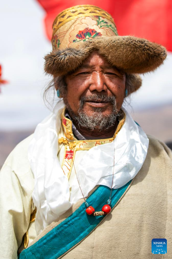 Nyima (R) attends a ceremony marking the start of spring farming in Quxar Town of Lnaze County, southwest China's Xizang Autonomous Region, March 16, 2025. (Xinhua/Jiang Fan)