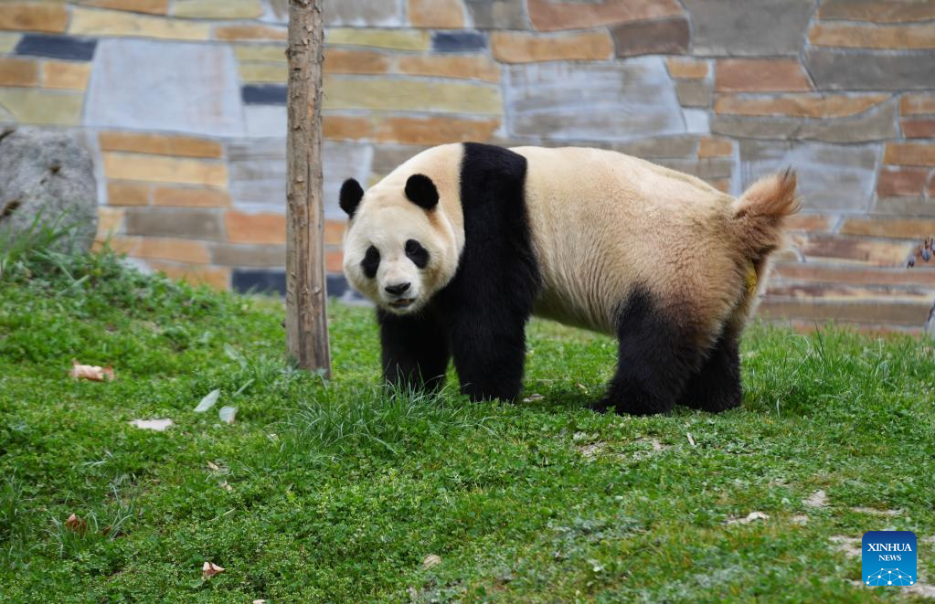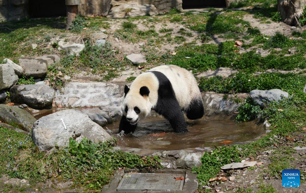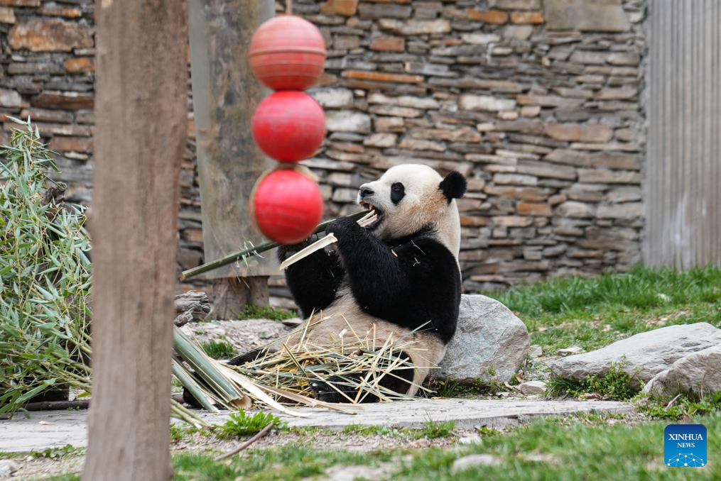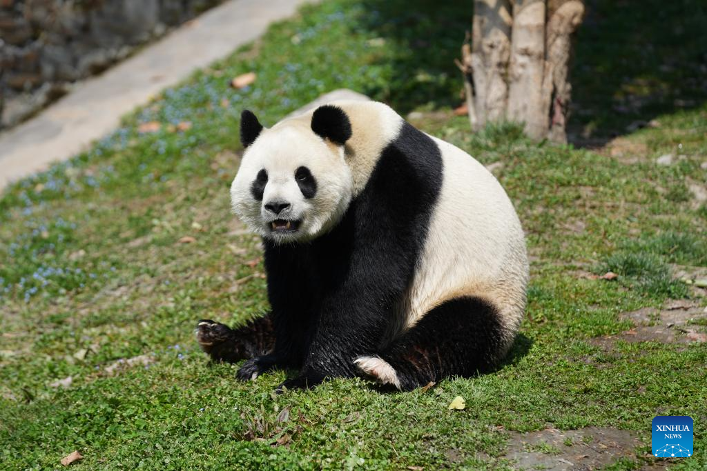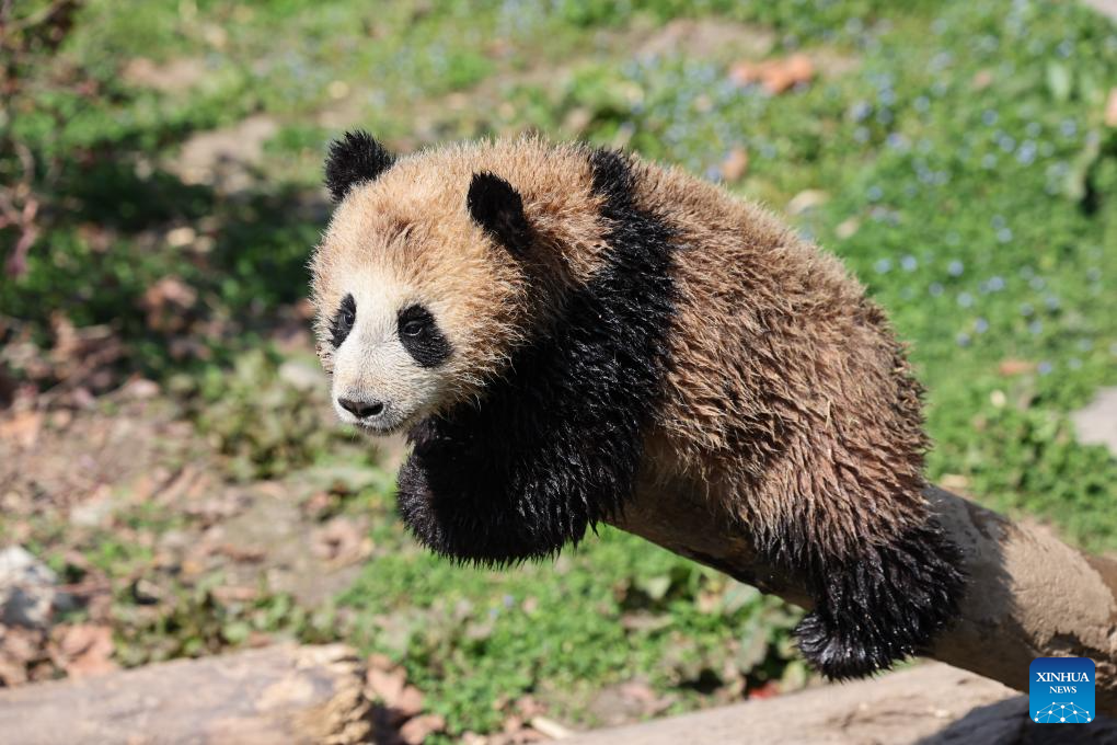 Giant panda Fu Bao has fun at the Shenshuping giant panda base of Wolong National Nature Reserve in southwest China's Sichuan Province, March 28, 2025. Giant pandas living at the base bathe in the sunshine and enjoy their leisurely life in the springtime. (Xinhua/Li Xiao)