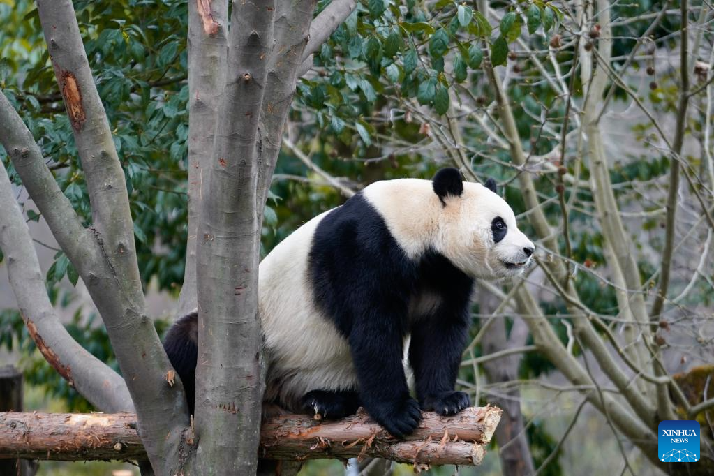 Giant panda Fu Bao has fun on a tree at the Shenshuping giant panda base of Wolong National Nature Reserve in southwest China's Sichuan Province, March 28, 2025. Giant pandas living at the base bathe in the sunshine and enjoy their leisurely life in the springtime. (Xinhua/Xu Bingjie)
