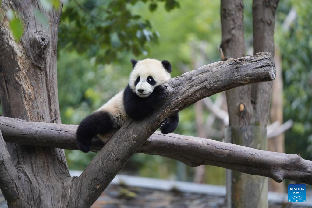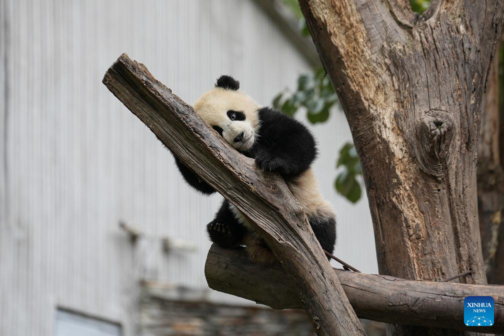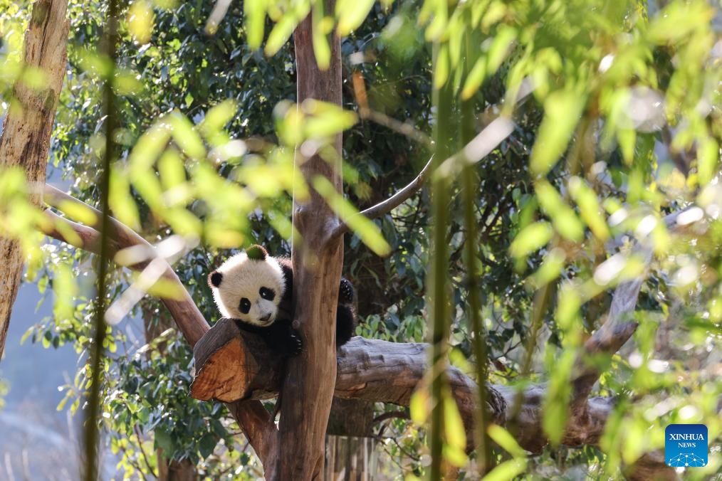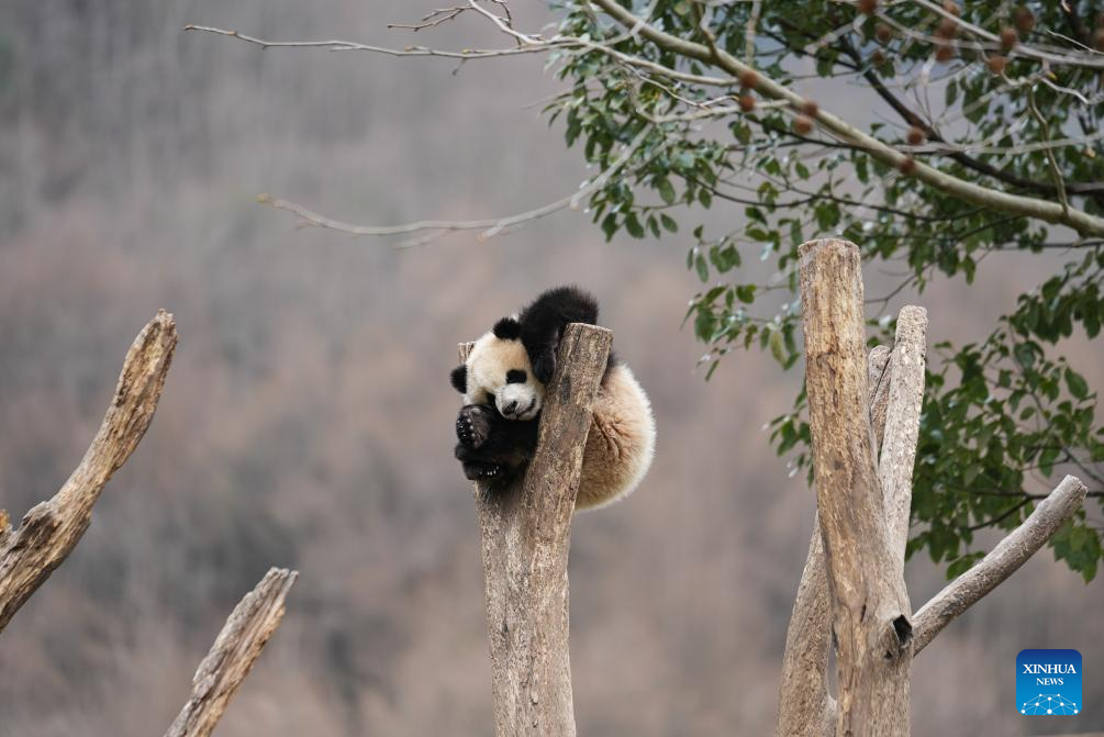 A giant panda cub has fun on a tree at the Shenshuping giant panda base of Wolong National Nature Reserve in southwest China's Sichuan Province, March 27, 2025. Giant pandas living at the base bathe in the sunshine and enjoy their leisurely life in the springtime. (Xinhua/Meng Tao)