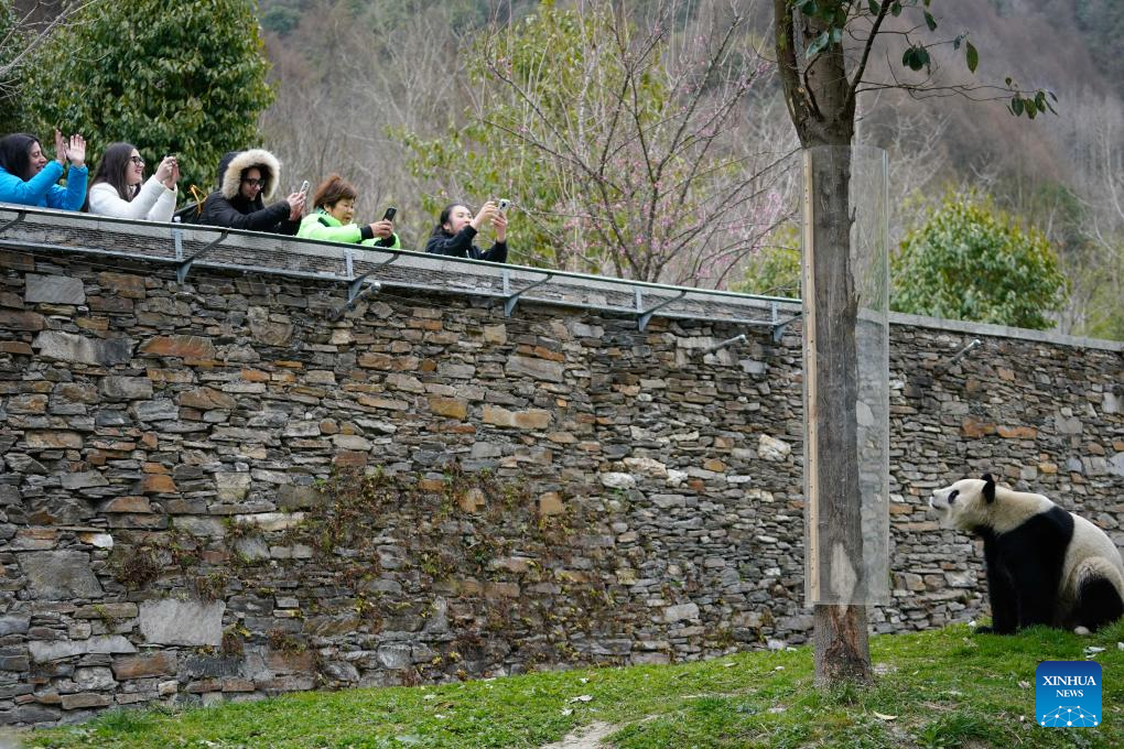 Visitors take photos of giant panda Nuo Mi at the Shenshuping giant panda base of Wolong National Nature Reserve in southwest China's Sichuan Province, March 28, 2025. Giant pandas living at the base bathe in the sunshine and enjoy their leisurely life in the springtime. (Xinhua/Xu Bingjie)