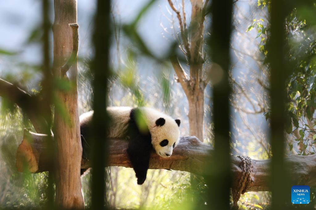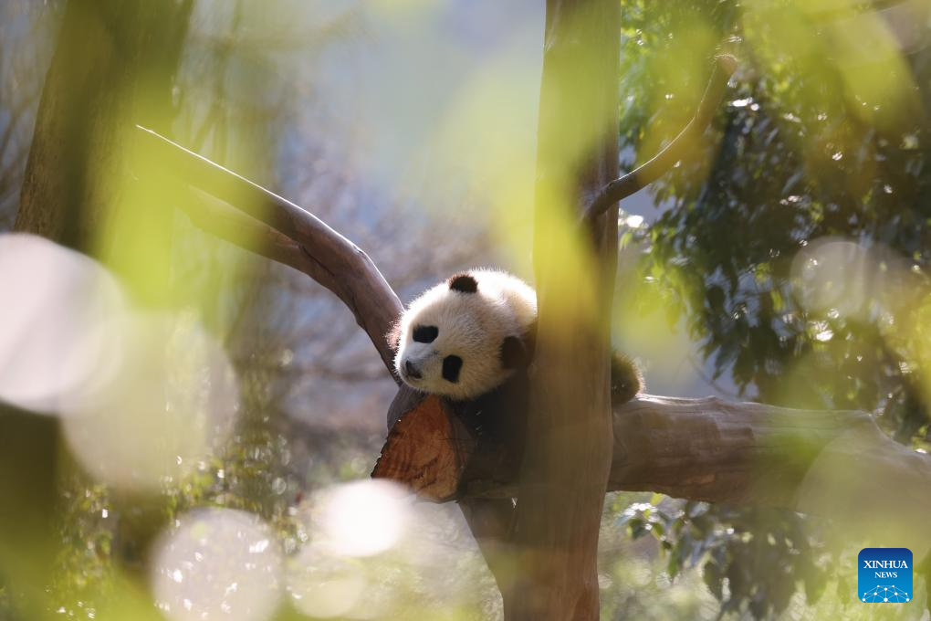 A giant panda cub rests on a tree at the Shenshuping giant panda base of Wolong National Nature Reserve in southwest China's Sichuan Province, March 28, 2025. Giant pandas living at the base bathe in the sunshine and enjoy their leisurely life in the springtime. (Xinhua/Li Xiao)