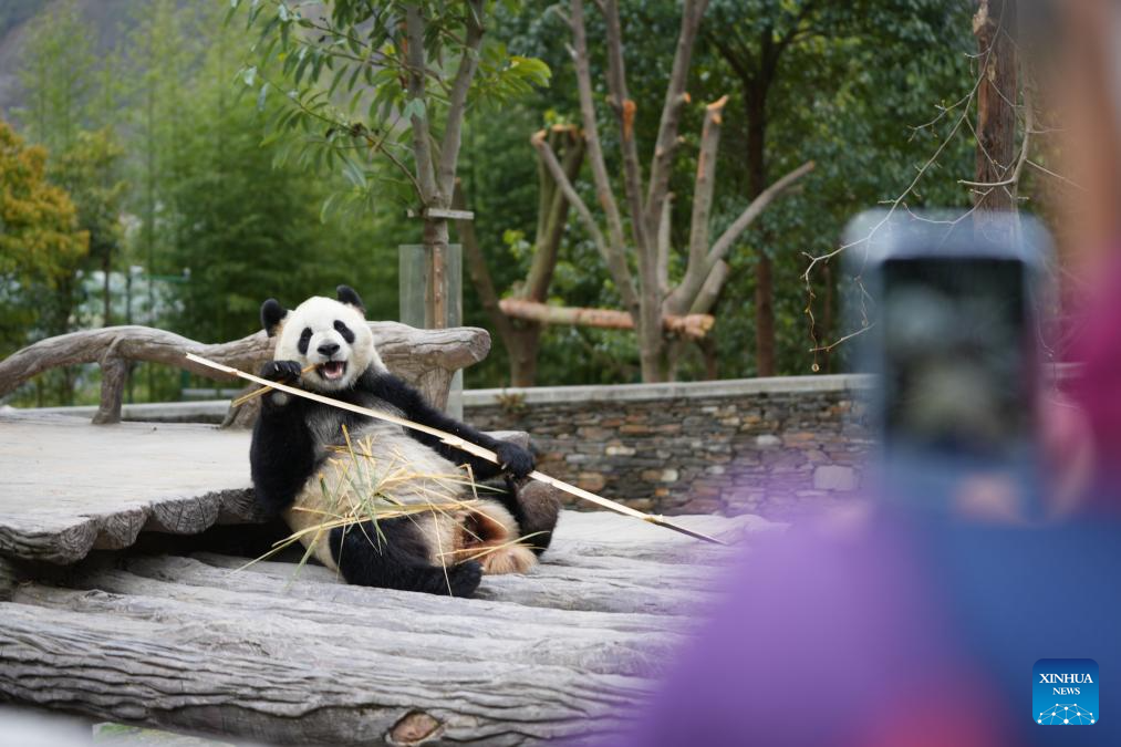 A visitor takes photos of giant panda Ling Lang at the Shenshuping giant panda base of Wolong National Nature Reserve in southwest China's Sichuan Province, March 28, 2025. Giant pandas living at the base bathe in the sunshine and enjoy their leisurely life in the springtime. (Xinhua/Li Xiao)