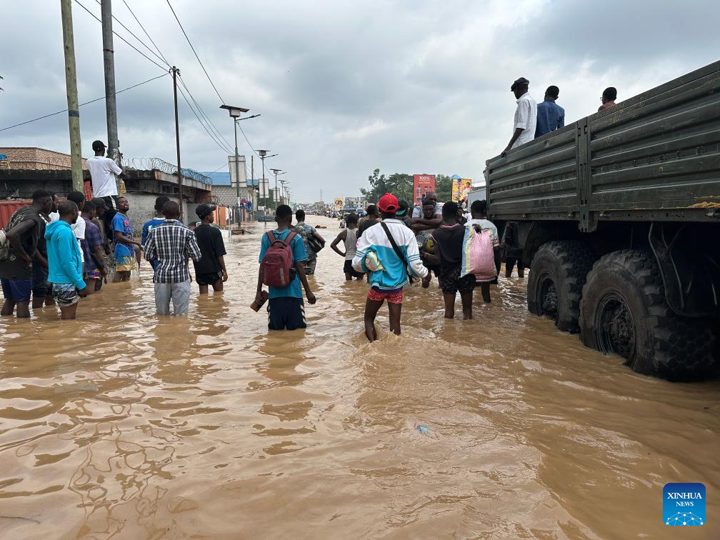 This photo taken with a mobile phone shows people walking through a flooded street in Kinshasa, capital of the Democratic Republic of the Congo (DRC), April 6, 2025. (Xinhua)