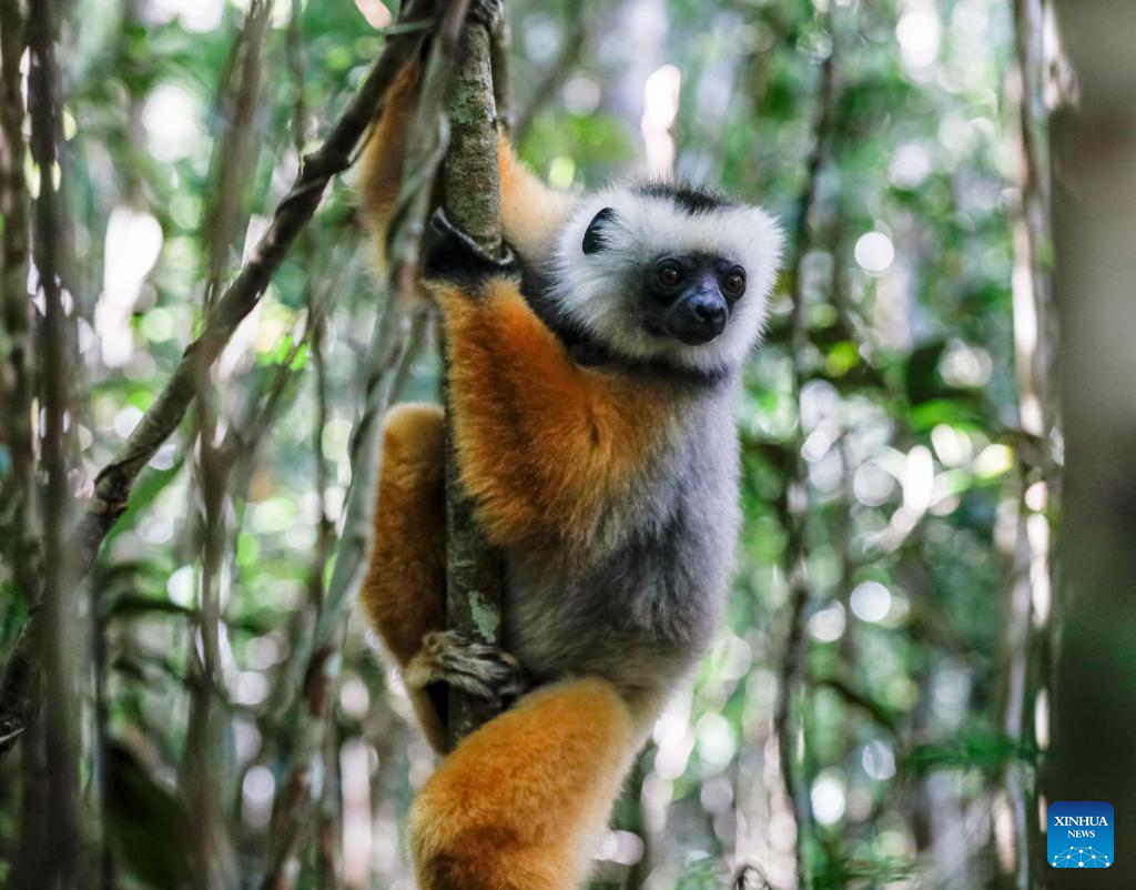 A diademed sifaka, a species of lemur, is seen at the Andasibe-Mantadia National Park in Madagascar, March 29, 2025. Madagascar, an Indian Ocean island country, boasts unique biodiversity due to its geographical isolation, with lemurs standing out as the most iconic group. According to the International Union for Conservation of Nature (IUCN), over 100 species of lemurs have been identified on the island. Some lemur species have been listed as critically endangered on the IUCN Red List of Threatened Species due to habitat destruction and illegal hunting in recent years. (Xinhua/Li Yahui)