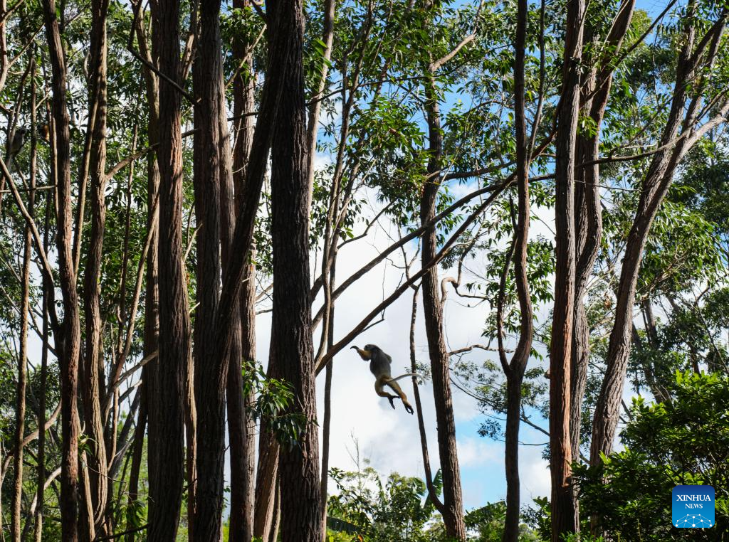 This photo taken on March 29, 2025 shows a lemur leaping from one tree to another in the jungle at the Andasibe-Mantadia National Park in Madagascar. Madagascar, an Indian Ocean island country, boasts unique biodiversity due to its geographical isolation, with lemurs standing out as the most iconic group. According to the International Union for Conservation of Nature (IUCN), over 100 species of lemurs have been identified on the island. Some lemur species have been listed as critically endangered on the IUCN Red List of Threatened Species due to habitat destruction and illegal hunting in recent years. (Xinhua/Li Yahui)