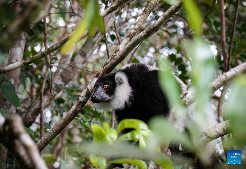 A black-and-white ruffed lemur is seen at the Andasibe-Mantadia National Park in Madagascar, March 29, 2025. Madagascar, an Indian Ocean island country, boasts unique biodiversity due to its geographical isolation, with lemurs standing out as the most iconic group. According to the International Union for Conservation of Nature (IUCN), over 100 species of lemurs have been identified on the island. Some lemur species have been listed as critically endangered on the IUCN Red List of Threatened Species due to habitat destruction and illegal hunting in recent years. (Xinhua/Li Yahui)