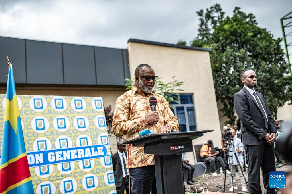Corneille Nangaa (L), political leader of the Congo River Alliance, a politico-military coalition aligned with the March 23 Movement (M23), speaks at the reopening ceremony of the Congo Savings Bank (CADECO) branch in Goma, the Democratic Republic of the Congo (DRC), April 7, 2025. (Photo by Zanem Nety Zaidi/Xinhua)