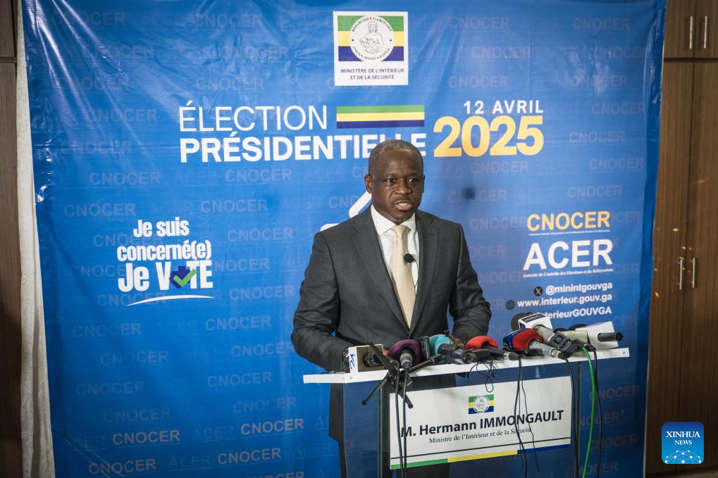 Interior Minister Hermann Immongault speaks at a press conference in Libreville, Gabon, on April 11, 2025. Gabon will hold its first presidential election on Saturday since a coup two years ago, marking the final phase of the country's political transition and the anticipated return to constitutional order. (Xinhua/Wang Guansen)