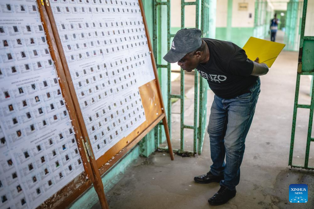 A man checks the voters' information at a polling station in Libreville, Gabon, on April 11, 2025. Gabon will hold its first presidential election on Saturday since a coup two years ago, marking the final phase of the country's political transition and the anticipated return to constitutional order. (Xinhua/Wang Guansen)