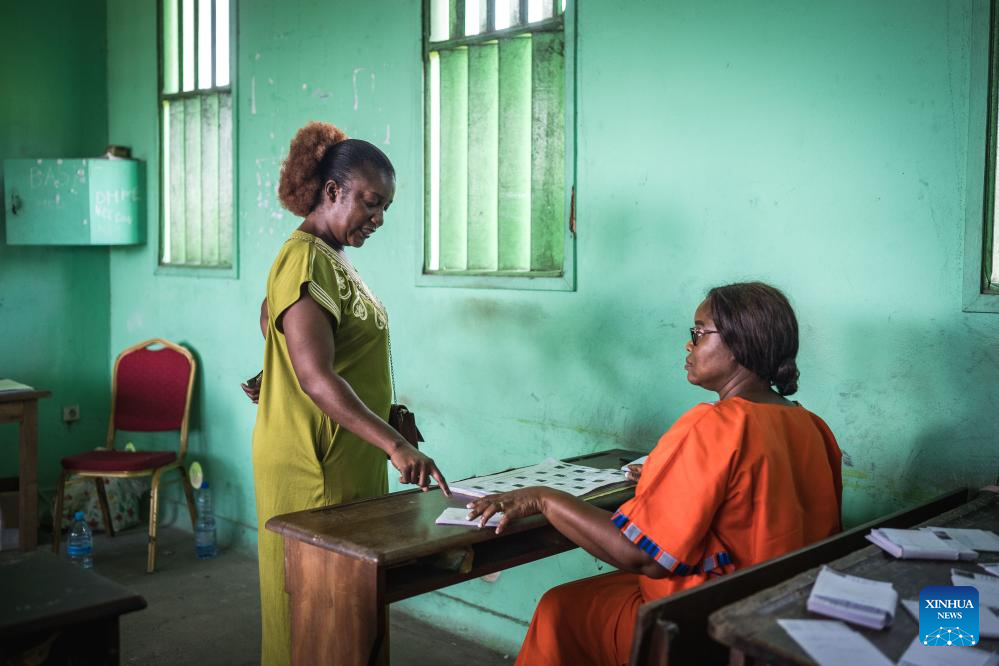 People check voters' information at a polling station in Libreville, Gabon, on April 11, 2025. Gabon will hold its first presidential election on Saturday since a coup two years ago, marking the final phase of the country's political transition and the anticipated return to constitutional order. (Xinhua/Zheng Yangzi)