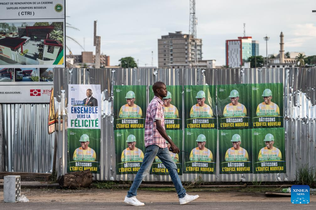 A man walks past the campaign posters in Libreville, Gabon, on April 10, 2025. Gabon will hold its first presidential election on Saturday since a coup two years ago, marking the final phase of the country's political transition and the anticipated return to constitutional order. (Xinhua/Wang Guansen)