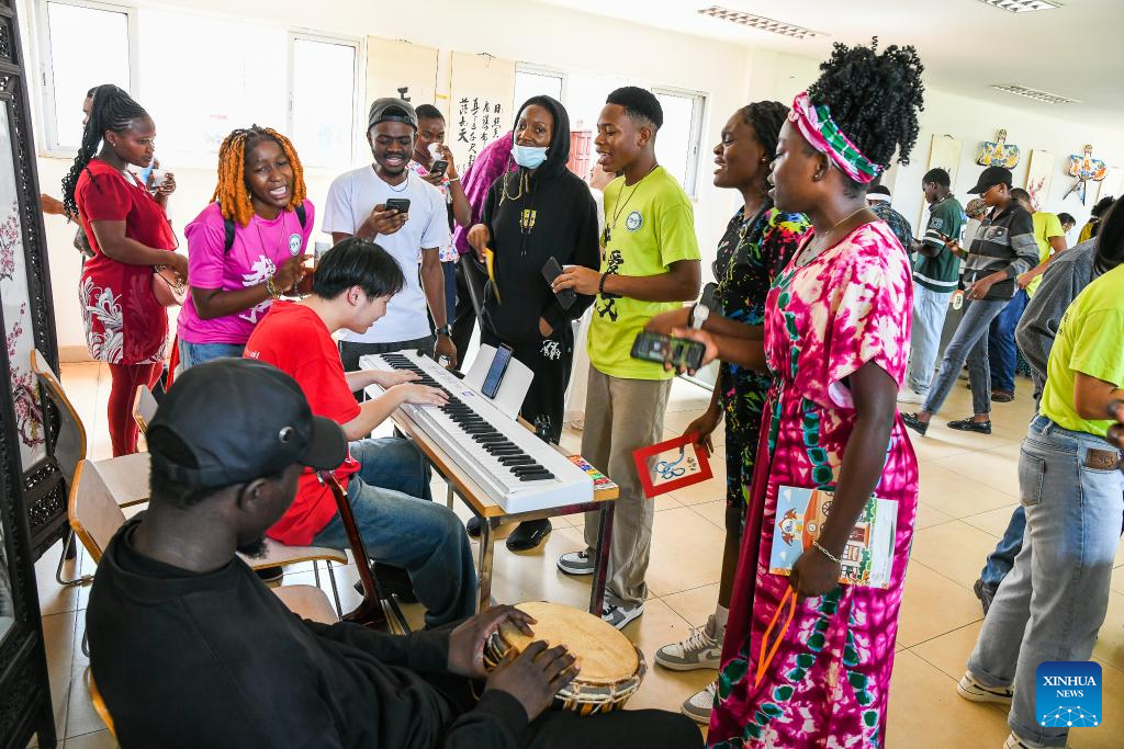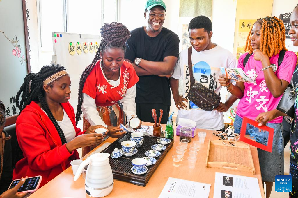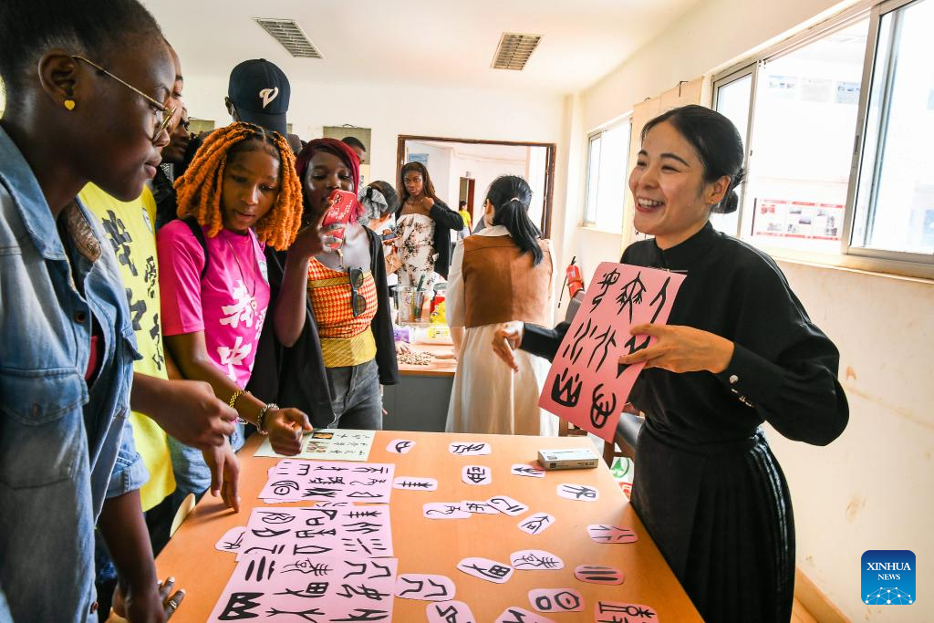 The event drew local students and language enthusiasts with immersive activities, including Chinese tea tasting, calligraphy rubbing, shadow play performances, oracle bone script games, and Chinese character puzzles. (Xinhua/Kepseu)
