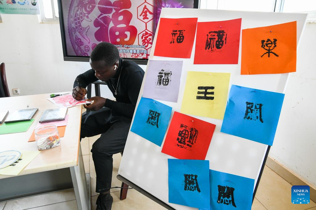 Local students and Chinese language enthusiasts make printing blocks for calligraphy rubbing at the Confucius Institute at the University of Yaounde II in Soa, Cameroon, April 12, 2025.