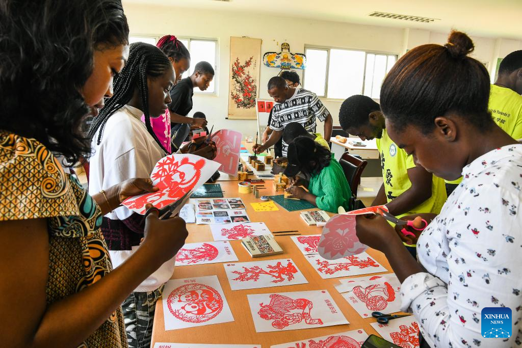 Local students and Chinese language enthusiasts experience Chinese paper cutting at the Confucius Institute at the University of Yaounde II in Soa, Cameroon, April 12, 2025.