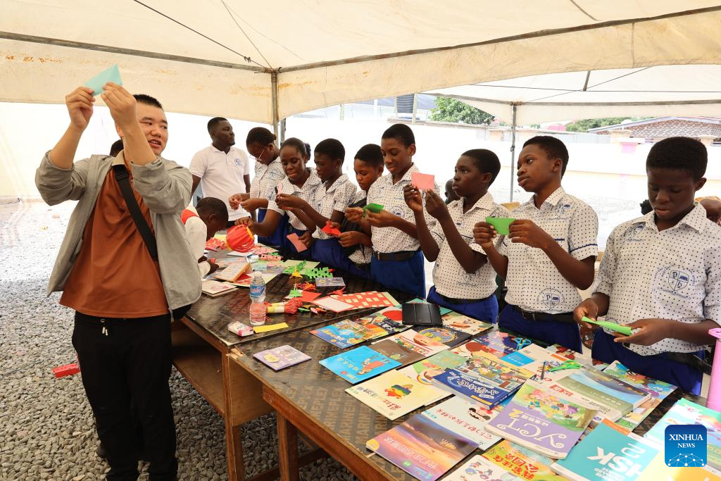 Students learn handicraft during a Chinese Language Day celebration in Central Region, Ghana, on April 16, 2025. Some schools in Ghana's Central Region and the Confucius Institute at the University of Cape Coast (CIUCC) on Wednesday presented splendid performances to herald the United Nations Chinese Language Day, annually observed on April 20. (Xinhua/Seth)