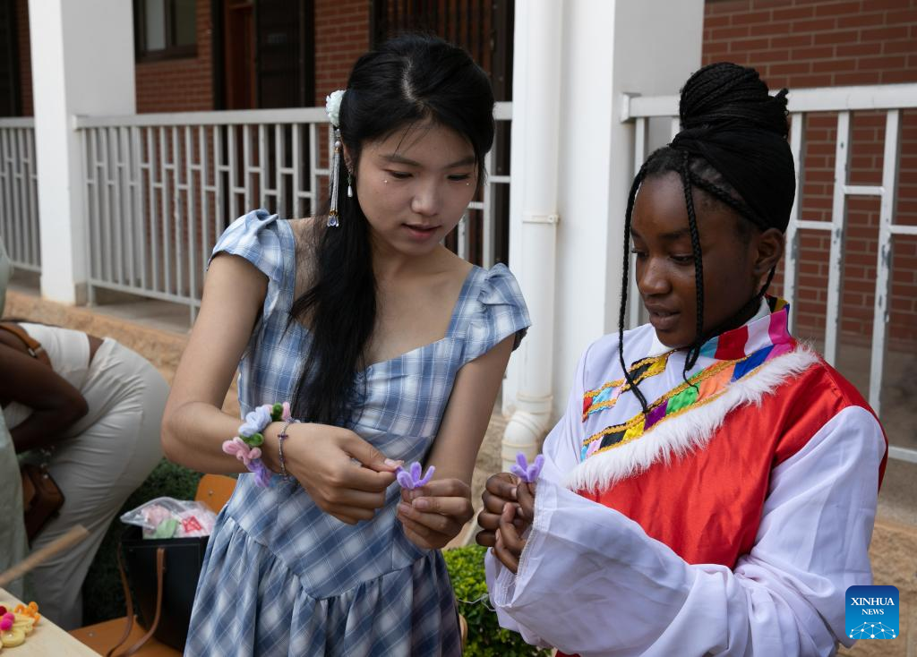 A teacher from the Confucius Institute at the University of Zambia instructs a student to make accessories in Lusaka, Zambia, on April 16, 2025. The Confucius Institute at the University of Zambia (UNZA) held celebrations on Wednesday to mark the 2025 International Chinese Language Day. (Xinhua/Peng Lijun)