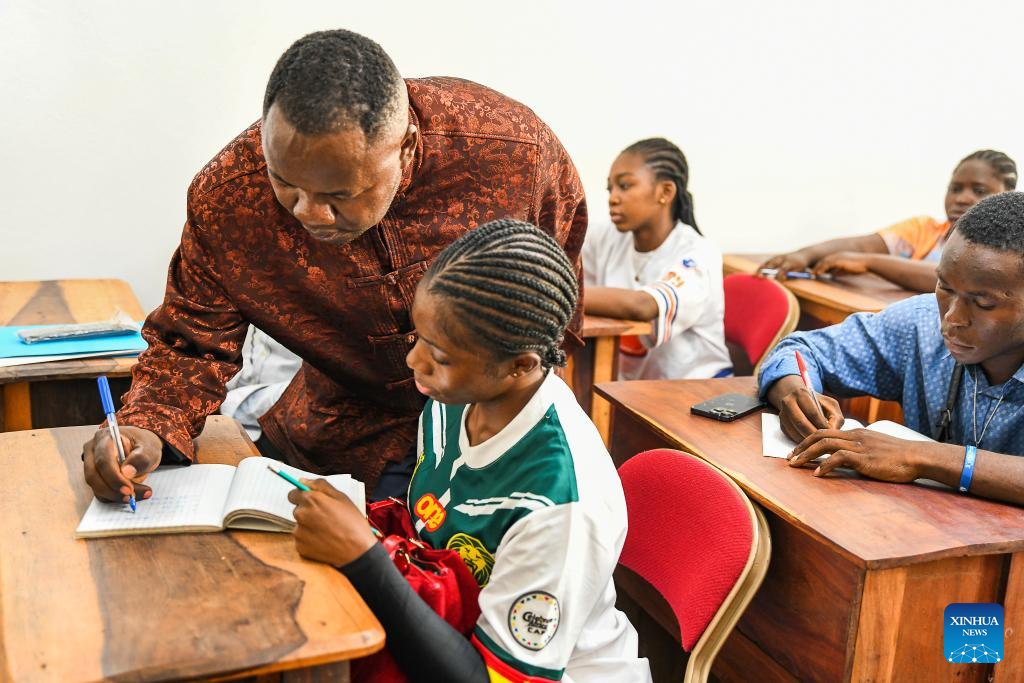 Celestin Alexis Nono (back) teaches his students Chinese in Yaounde, capital of Cameroon, April 11, 2025. (Xinhua/Kepseu)