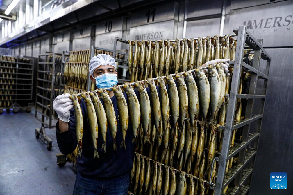 A worker arranges salted fish at a factory in Port Said, Egypt, on April 19, 2025. As dawn breaks on Orthodox Easter Monday, Egyptians of all faiths gather in parks, on balconies, and along riverbanks, clutching plates of fesikh -- a pungent, fermented fish dish that has anchored the country's millennia-old festival, Sham El-Nessim, since the days of the pharaohs. (Xinhua/Ahmed Gomaa)