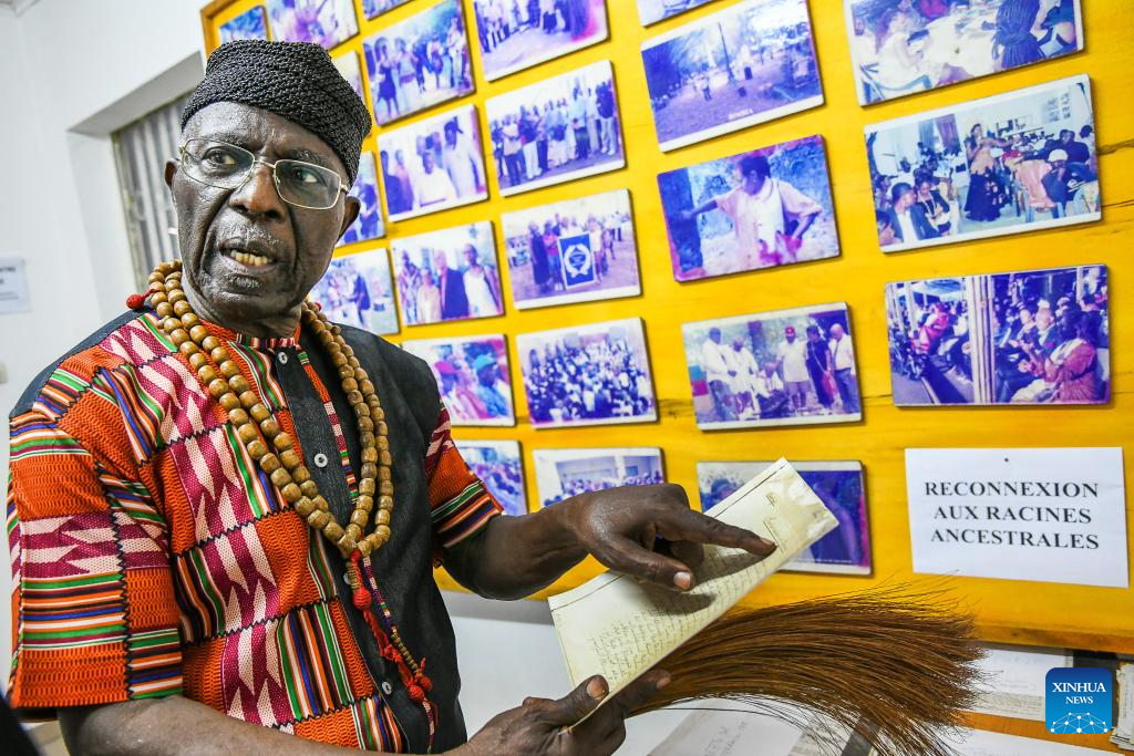 Alexandre Kum'a Ndumbe Ill, a Cameroonian prince, historian, and professor emeritus at several universities, presents traditional art objects at his office in Douala, Cameroon, on March 17, 2025. (Xinhua/Kepseu)