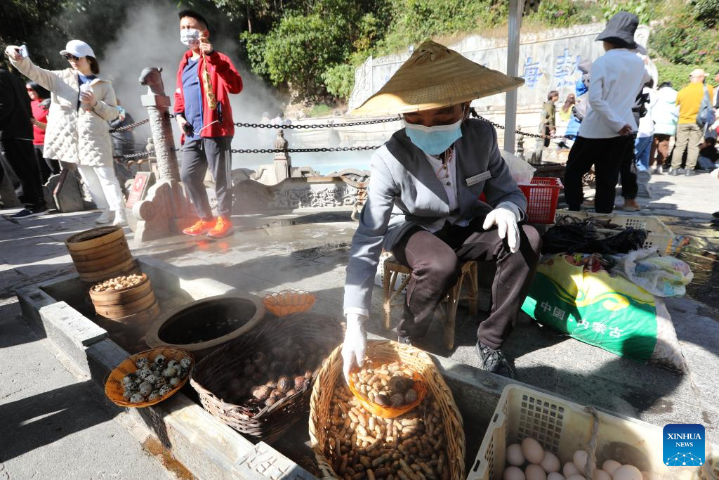 A staff member boils eggs and peanuts using geothermal heat at a hot spring scenic area in Tengchong, southwest China's Yunnan Province, Jan. 22, 2023. Home to 99 active and extinct volcanoes, Tengchong is rich in geothermal resources. The city's environment is known by locals as being "half water half fire," a feature that has been utilized to develop tourism. (Photo by Gong Zujin/Xinhua)