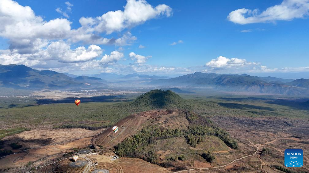 An aerial drone photo taken on Dec. 22, 2023 shows volcanoes in a national geological park in Tengchong, southwest China's Yunnan Province. Home to 99 active and extinct volcanoes, Tengchong is rich in geothermal resources. The city's environment is known by locals as being "half water half fire," a feature that has been utilized to develop tourism. (Photo by Zhao Hui/Xinhua)