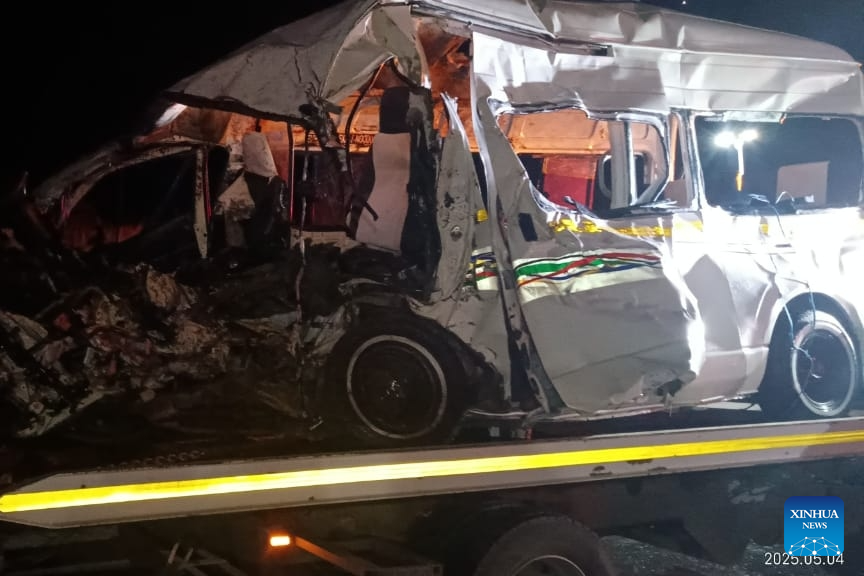 This photo taken on May 4, 2025 shows a damaged minibus taxi at the scene of a head-on collision in the Eastern Cape Province of South Africa. Fifteen people were killed and five others injured in a head-on collision in the Eastern Cape Province of South Africa on Saturday night, local authorities confirmed on Sunday. (South Africa's Eastern Cape Department of Transport/Handout via Xinhua)