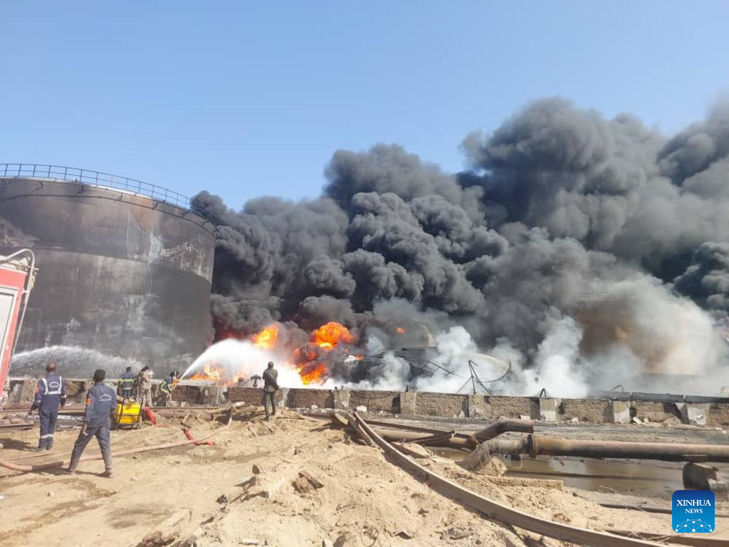 Firefighters battle a fire after a drone attack on a fuel depot in Port Sudan, eastern Sudan, on May 6, 2025. The drone attacks on Tuesday struck strategic sites in Port Sudan, a port city on the Red Sea in eastern Sudan, including the international airport, a hotel near the temporary presidential palace, and an oil export port, according to eyewitnesses. (Sudanese Ministry of Culture and Information/Handout via Xinhua)