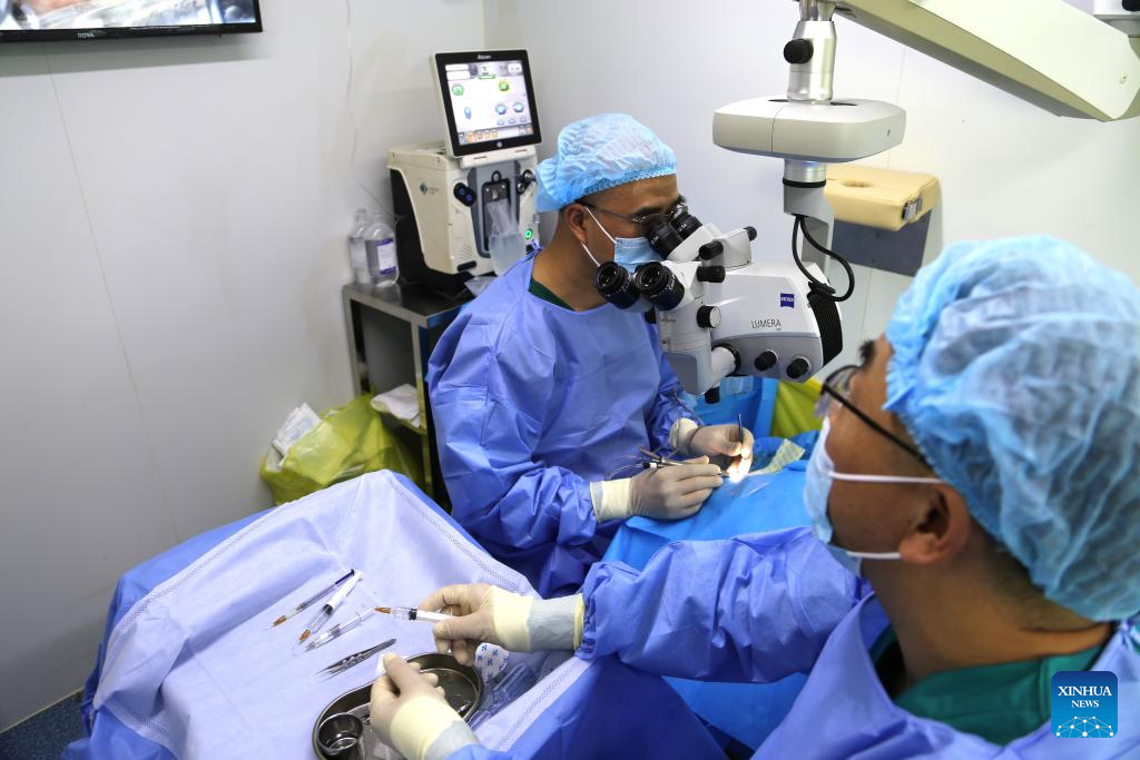 Zhang Zhaode (L), a veteran ophthalmologist from China's Fujian Province, performs a vision restoration surgery for a cataract patient at the Regional Hospital Center of Fatick in Fatick, Senegal, May 2, 2025. (Xinhua/Si Yuan)